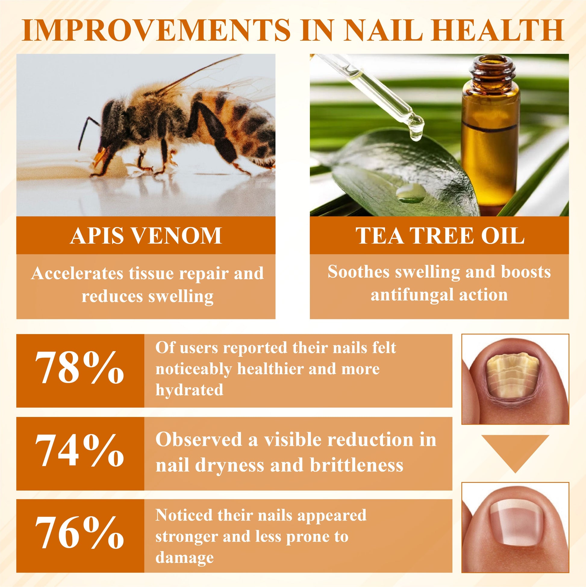 Apis venom supports the repair of damaged nail tissue by stimulating cellular regeneration and reducing inflammation, which promotes healthier and stronger nail growth. These results suggest that the spray is an effective therapeutic option for managing fungal nail conditions while enhancing overall nail resilience and appearance.