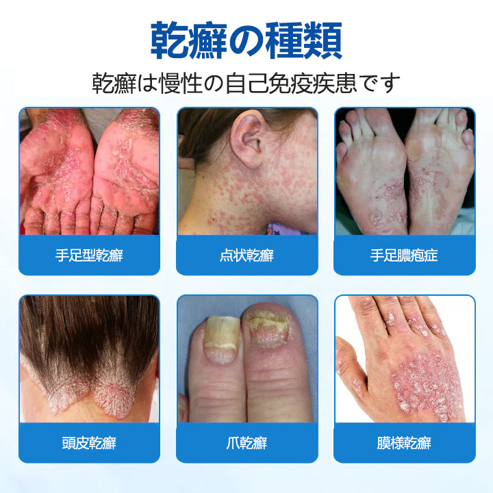 乾癬は慢性の自己免疫疾患で、免疫システムが正常で健康な皮膚細胞を誤って攻撃し、過剰な成長、蓄積、鱗屑、赤みを引き起こします。この疾患は体のさまざまな部位に現れ、敏感な部分に水疱や汗疹を引き起こし、強いかゆみと簡単に出血するひび割れた皮膚、日常的な引き金に対する接触皮膚炎様の反応、日常生活に影響を与える手足の激しい剥離、厚い鱗屑のある典型的な乾癬の板状病変、そして暖かい環境で悪化する汗疹の症状が現れます。