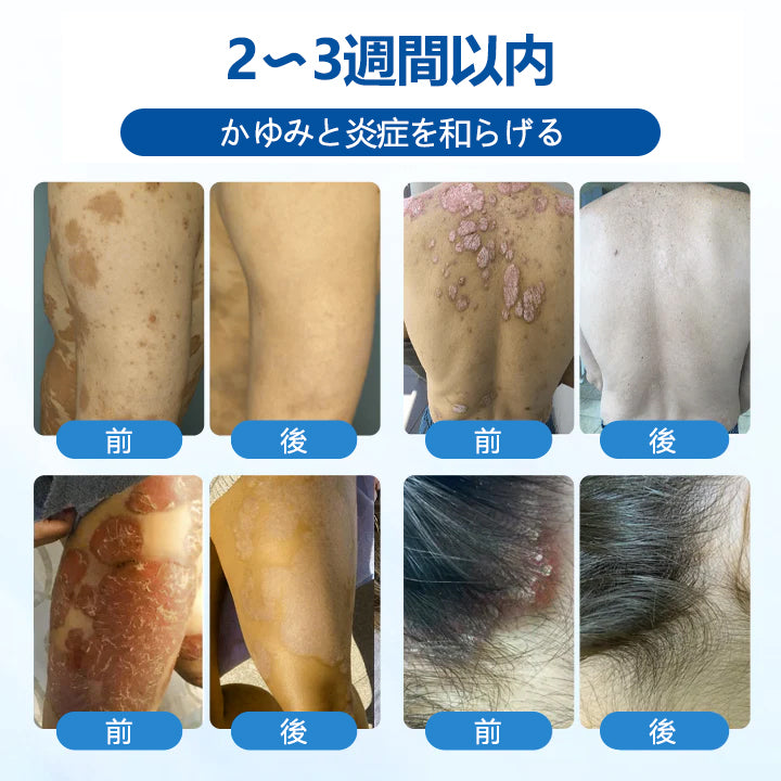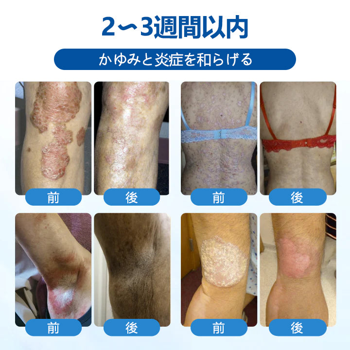 第2週:肌の質感に顕著な改善。天然の抗酸化物質が炎症を調節し、健康的な細胞再生を促進。乾癬の板状病変が薄くなり、炎症が軽減します。